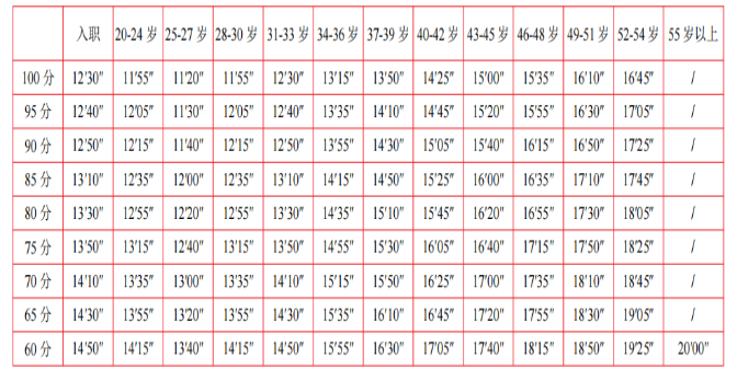 1.体能测试:体能测试由各大队组织实施,所有参加招聘人员需按照《政府专职消防员体能考核标准》(附件3)进行体能测试,满分100分。其中,3000米跑30分、100米跑30分、单杠引体向上20分、双杠臂屈伸20分。战斗员体能测试总成绩低于60分的,予以淘汰;专职文书体能测试总成绩低于50分的,予以淘汰。