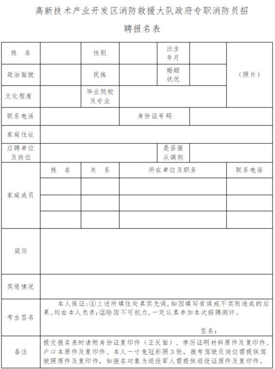 1.高新技术产业开发区消防救援大队政府专职消防员招聘报名表