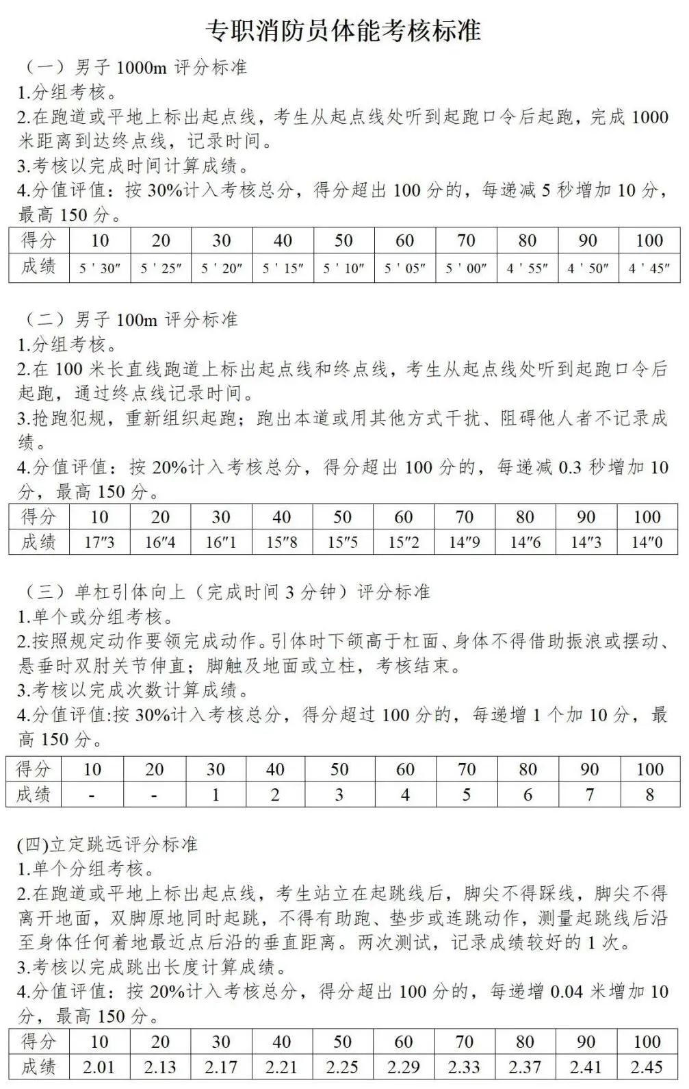 1.体能测试:体能测试由各县(区)大队组织实施,所有参加招聘人员需按照《政府专职消防员体能考核标准》(附件3)进行体能测试,满分100分。其中,1000米跑30分、100米跑20分、单杠引体向上30分、立定跳远20分。体能测试总成绩低于60分的,予以淘汰。