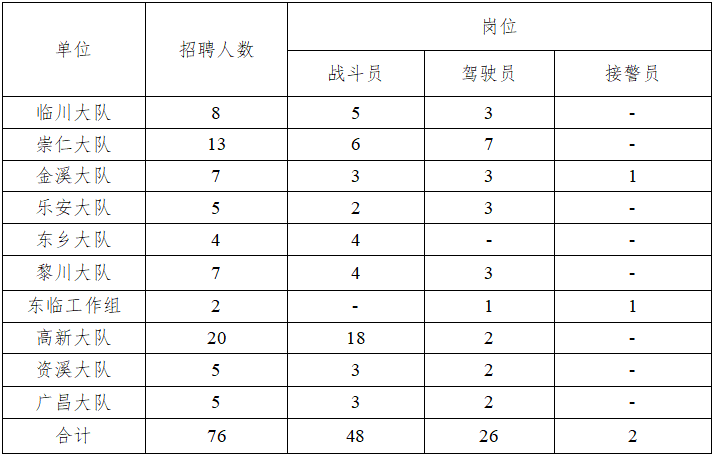 为满足社会经济迅速发展对消防力量的需求,有效提升社会灾害防控能力,抚州市消防救援支队面向社会公开招聘76名政府专职消防员,均为男性。现将有关事项公告如下: