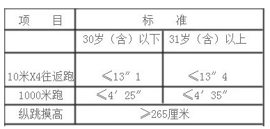 体能测试的项目和标准参照按照《公安机关录用人民警察体能测评项目和标准(暂行)》(人社部发〔2011〕48号)和中组部《关于同意调整公安机关录用人民警察体能测评有关项目测评次数的复函》等文件执行。体能测评不合格的,不得确定为进入面试人选。考核项目分为三项:男子1000米跑(40分),10米×4往返跑(30分),纵跳摸高(30分),满分100分。每个项目有一次补考机会,取最优成绩,所有项目结束后,考生确认自己得分,并当场签字。